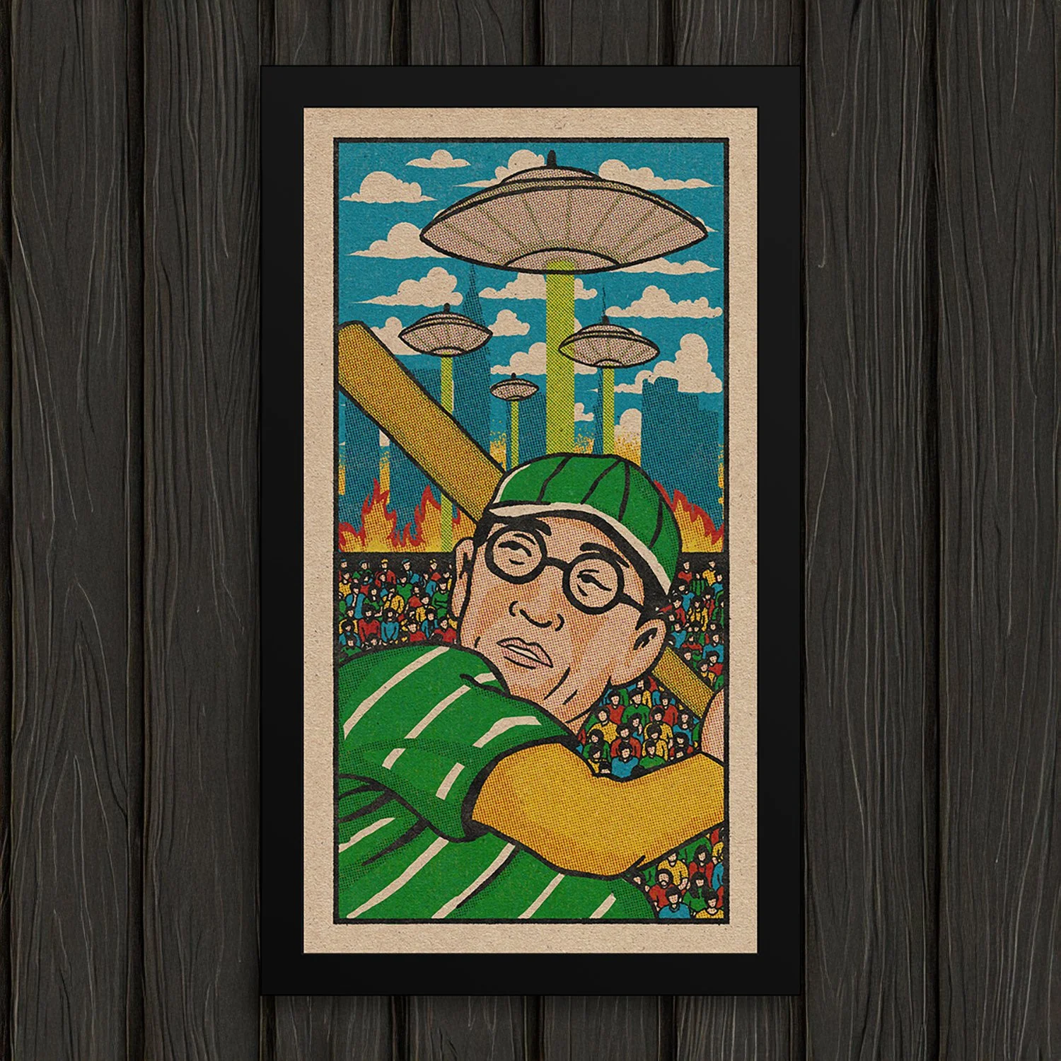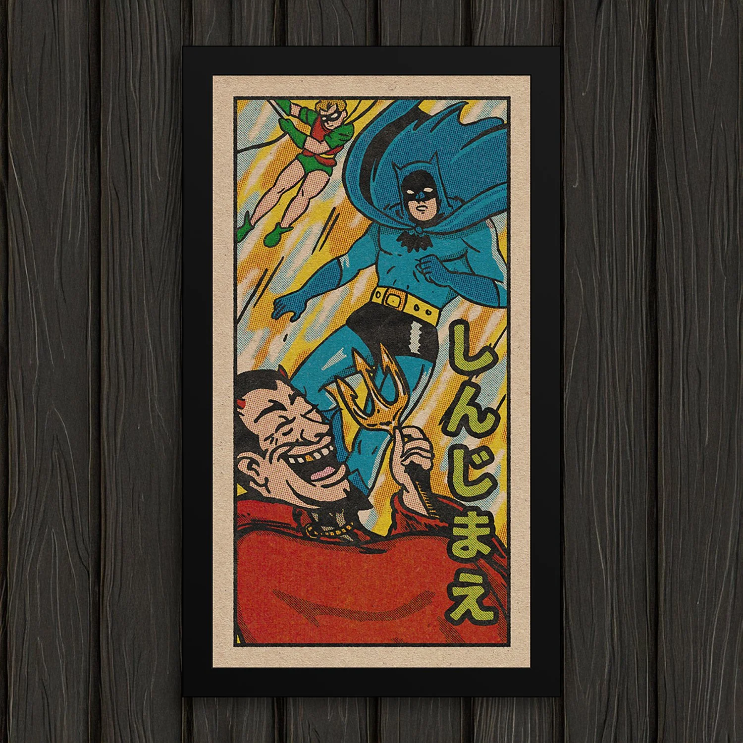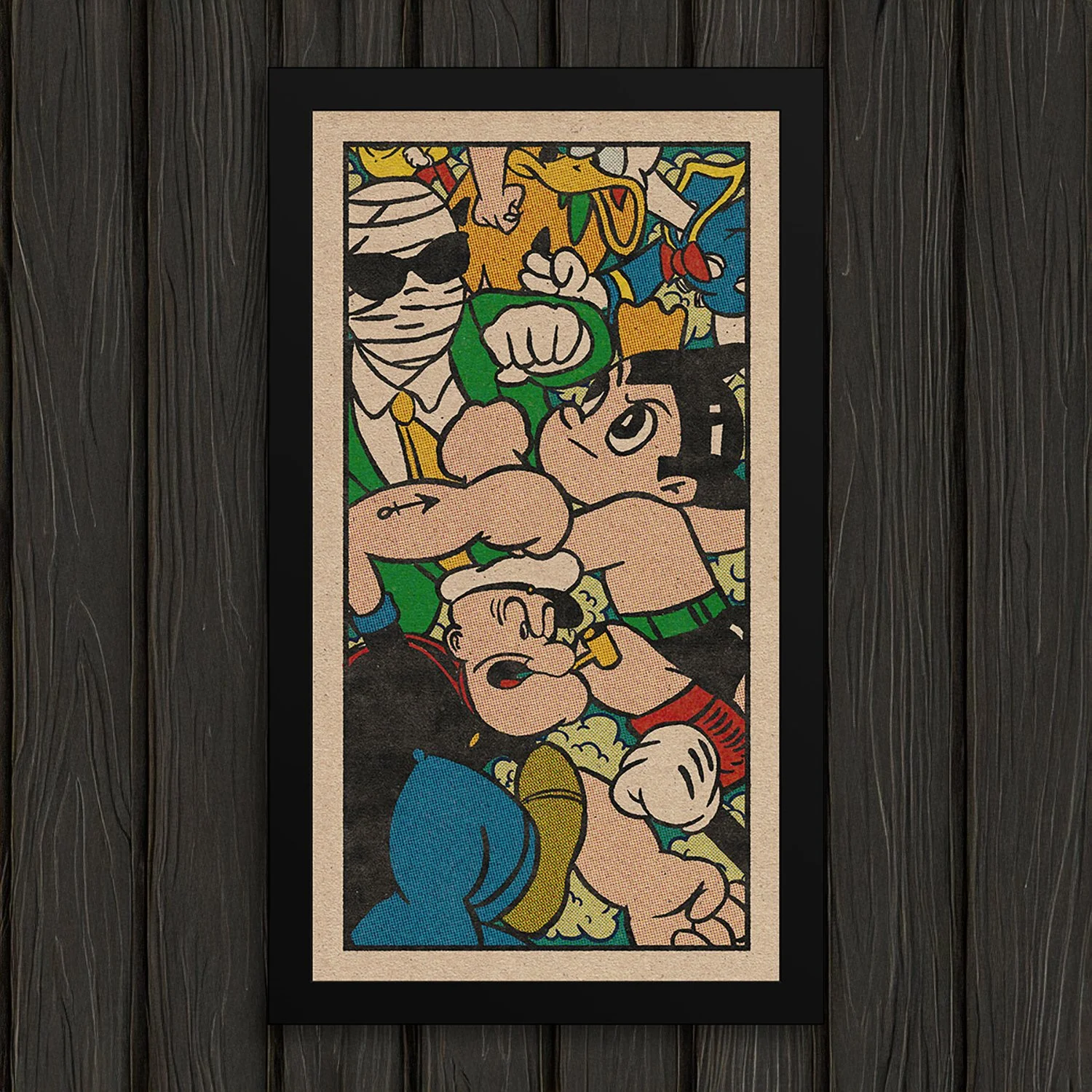 I was commissioned by the owner of Hanzo, a contemporary Japanese restaurant, to create artwork for its interior. Inspired by the vintage Japanese card game Menko, I sought to merge elements of Japanese and American pop culture in a visually cohesive way that complements the restaurant’s atmosphere. Menko, much like the U.S. fad of POGs, features thick, printed cards depicting anime, manga, and pop culture icons, used in a game of skill and strategy. Drawing from this concept, my pieces blend familiar American and Japanese cultural references, reinforcing the restaurant’s fusion of tradition and modernity.