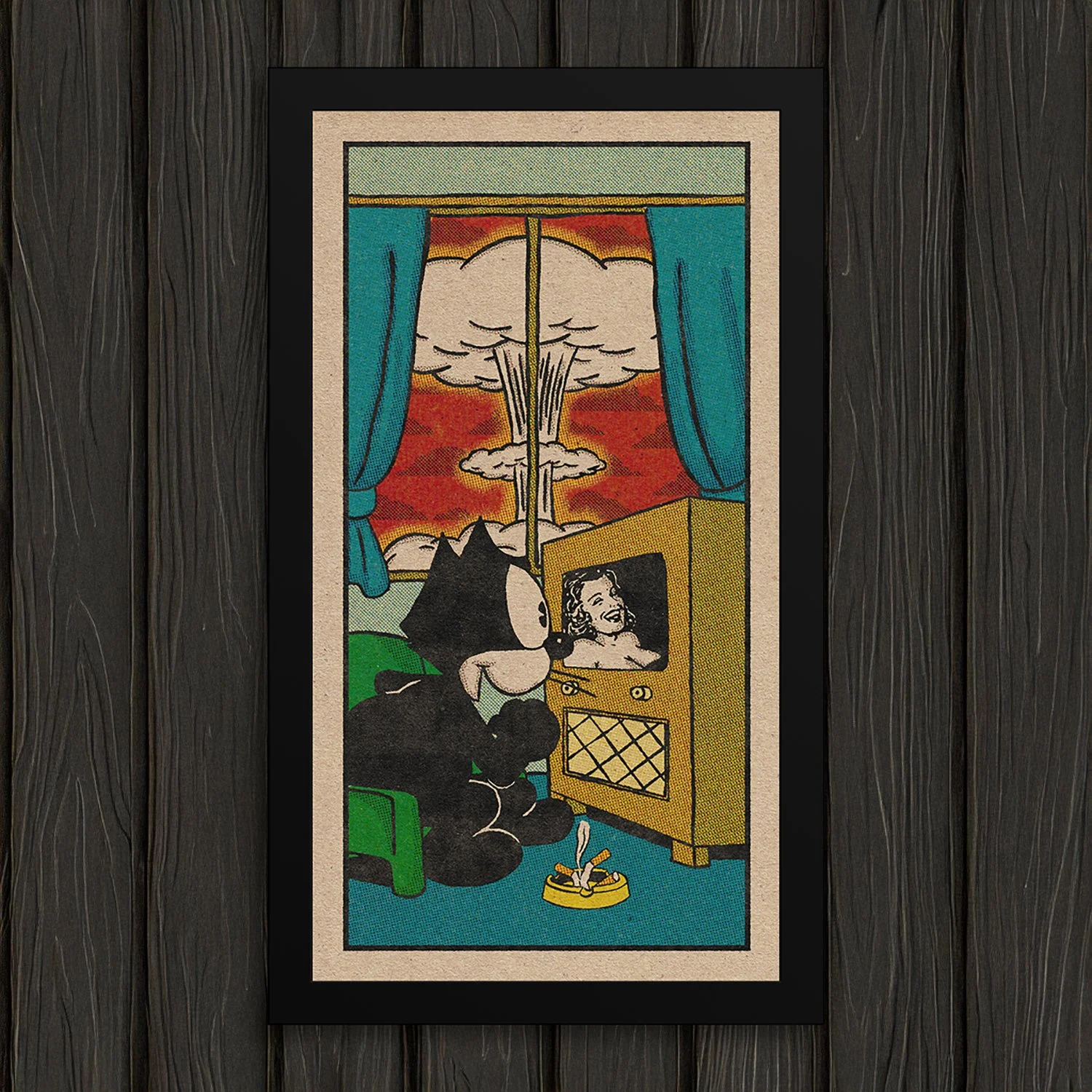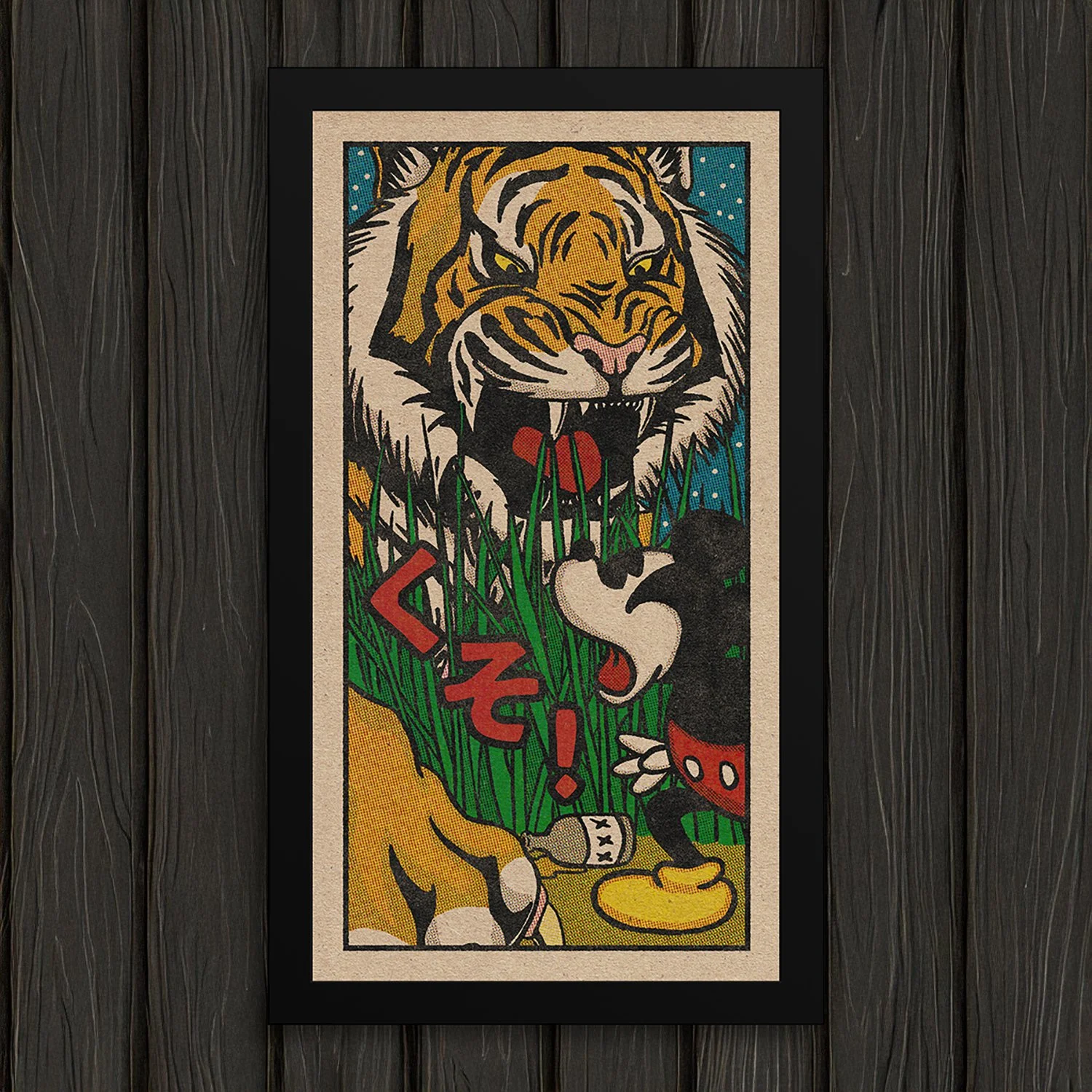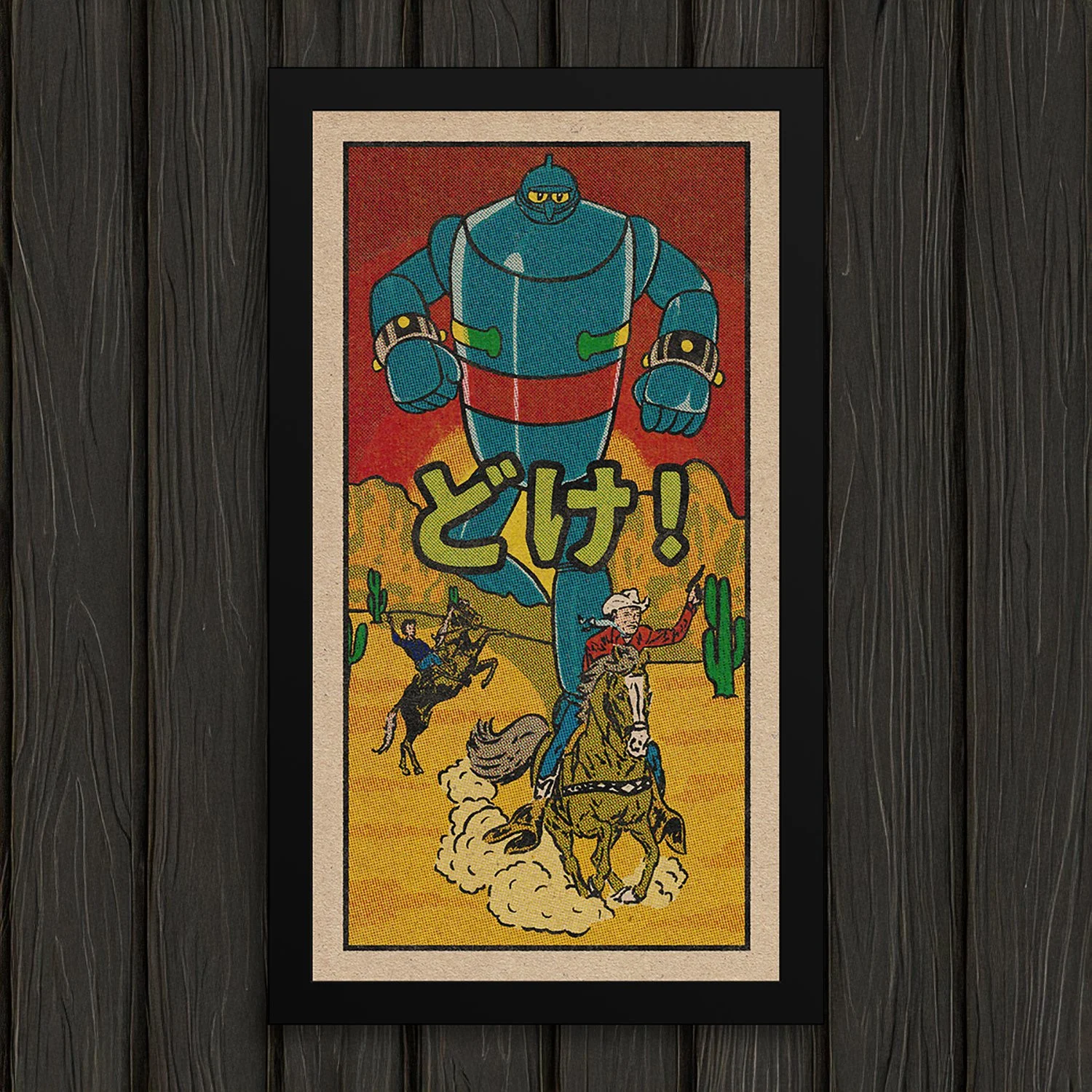 I was commissioned by the owner of Hanzo, a contemporary Japanese restaurant, to create artwork for its interior. Inspired by the vintage Japanese card game Menko, I sought to merge elements of Japanese and American pop culture in a visually cohesive way that complements the restaurant’s atmosphere. Menko, much like the U.S. fad of POGs, features thick, printed cards depicting anime, manga, and pop culture icons, used in a game of skill and strategy. Drawing from this concept, my pieces blend familiar American and Japanese cultural references, reinforcing the restaurant’s fusion of tradition and modernity.